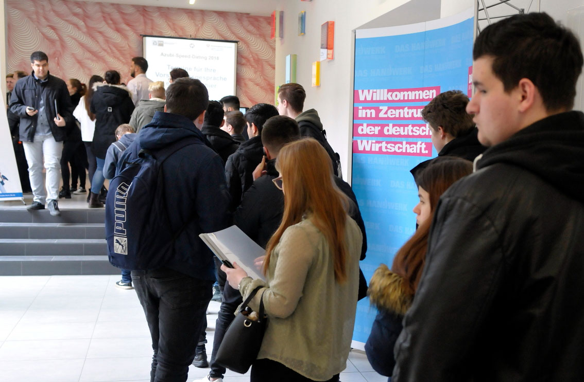 Der Weg zu einem Ausbildungsplatz kann manchmal mühsam sein und lange dauern. Nicht aber für die Teilnehmer am Azubi-Speed-Dating 2019 – denn schneller geht Bewerben nicht! Mit guter Vorbereitung und aussagefähigen Bewerbungsunterlagen können sie sich direkt bei Unternehmen vorstellen und erhalten anschließend ein Feedback. 10 Minuten stehen pro Gespräch zur Verfügung, um den Personalverantwortlichen von sich zu überzeugen. Natürlich kann man sich auch bei mehreren Unternehmen vorstellen und so seine Chancen auf einen Ausbildungsplatz, auch noch für dieses Jahr, erhöhen. An der gemeinsamen Veranstaltung der Kreishandwerkerschaft Mönchengladbach, Agentur für Arbeit Mönchengladbach und IHK Mittlerer Niederrhein nehmen 33 Unternehmen aus Industrie und Handwerk teil.